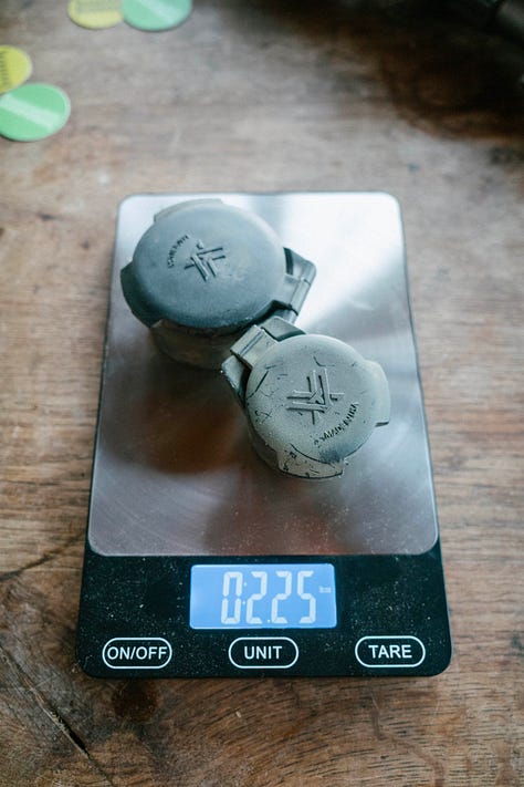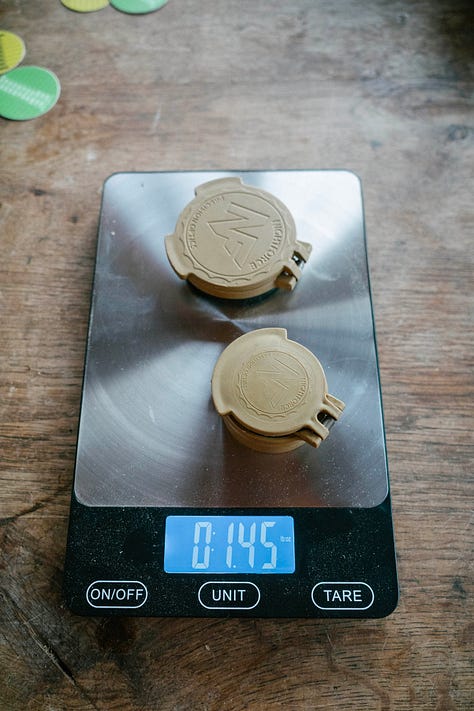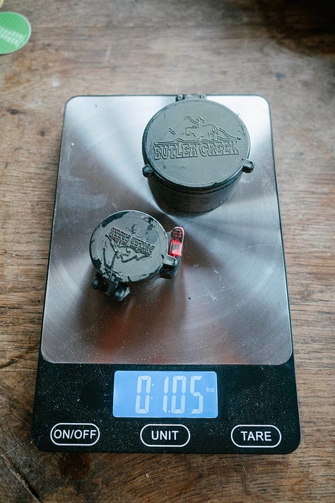Scope caps are a rare feature of a bowling rifle where the more you spend, it doesn't translate to performance. Tenebraex Caps, often lauded as some of the best, have failed Walter more than the cheapest option, the simplest option, the Butler Creeks. Under recoil, the pin holding the cap in place has backed out, causing the spring to pop out and the cap to flop around like a plastic bag in the wind. The Butler Creeks, or the Vortex Defenders, on the other hand, have never failed Walter, on the range or in the mountains hunting. They are the lightest option, come in all sorts of sizes and configurations, and are the cheapest. Walter’s ailing eyes like the red button to deploy the rear cap.